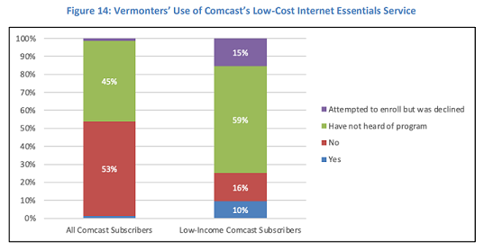 Only one percent of all Comcast subscribers, and 10 percent of low-income subscribers, participate in the Comcast Internet Essentials program. Another 59 percent of low-income subscribers were unaware of the program, and 15 percent attempted to enroll but were declined.