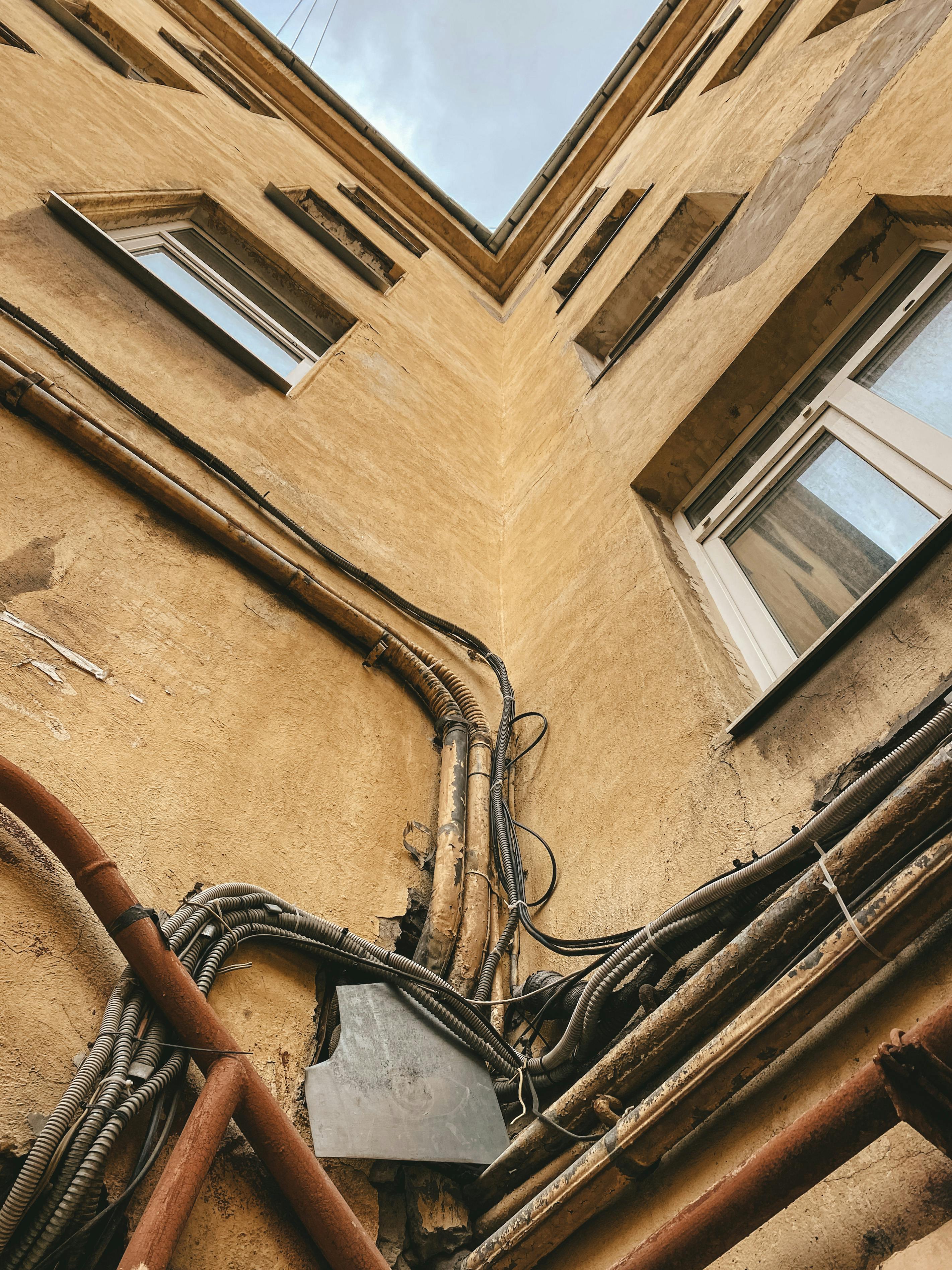 Header image of apartment building with old wiring courtesy of Pexels Public Domain