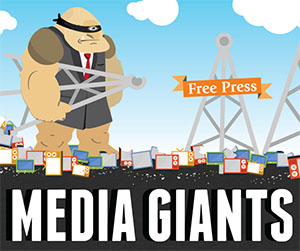 When we think of the enormous cyclops we don't usually imagine him in a suit and tie but the Free Press does and it works. In their recent Media Giants infographic, the Free Press uses the hulking one-eyed beast to represent corporate behemoths slowly taking control of our media through smaller shell companies.