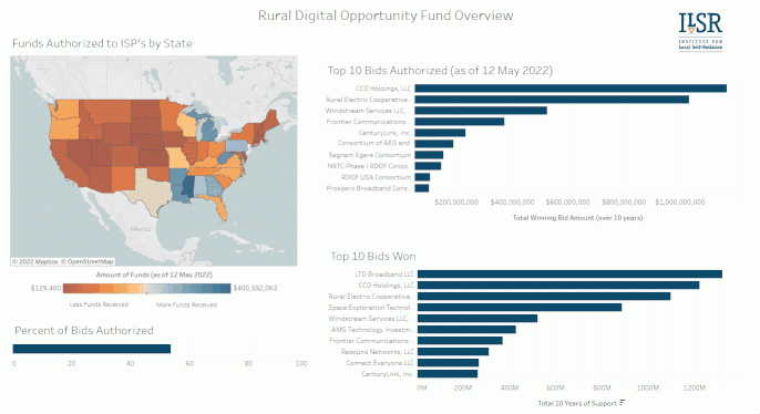 The dashboard also contains graphs which show the percentage of funding disbursed so far, as well as the top ten original bidders and the ten bidders which have received the largest amount of support so far. In the graph, CCO Holdings represents the collective bids of Charter Spectrum; most of the other provider names are relatively clear, with a few consortiums mixed in).