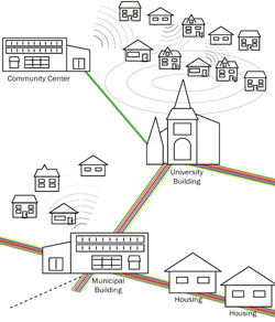Unlike traditional deployment models, where buildout is dependent upon a single entity, wireless mesh requires a certain level of responsibility on the individual participant – but, more importantly, it is driven by larger community collaboration. For example, universities can offer backhaul and interconnection to research and education networks. They can also contribute by sharing their technical knowledge and encouraging student groups and/or classes to assist with mesh deployment to foster skill-sharing and real-world learning labs along with network and application development.There is a strong focus on getting buy-in from the community. We might call this the "Don't be Minneapolis" rule, where far fewer people and even city departments have used the privately owned, publicly subsidized Wi-Fi service because those pushing the network never bothered to actually get buy-in as they rushed their vision through the City Council, committing the City to years of budgetary waste and frustration. Our recent report on some of the most advanced muni fiber networks profiled three communities that built citywide networks requiring much less citizen participation, though some in Lafayette would definitely prefer to be better able to influence network decisions. The approach outlined by OTI is more focused on serving neighborhoods of people who are engaged and more willing to take a more direct responsbility for connecting to the Internet. These are different approaches suited to different communities and local assets and thus we don't think it is appropriate to suggest one is superior to the other. However, we do have some concerns about the impact of any neighborhood-by-neighborhood strategy on the need for and cost of ensuring universal service. Such concerns will be spelled out more clearly in future posts but we hope that those pursuing this approach think carefully about how to make sure all neighborhoods will eventually be connected. We have no doubt that OTI takes this very seriously and we hope those who are inspired by them do as well.